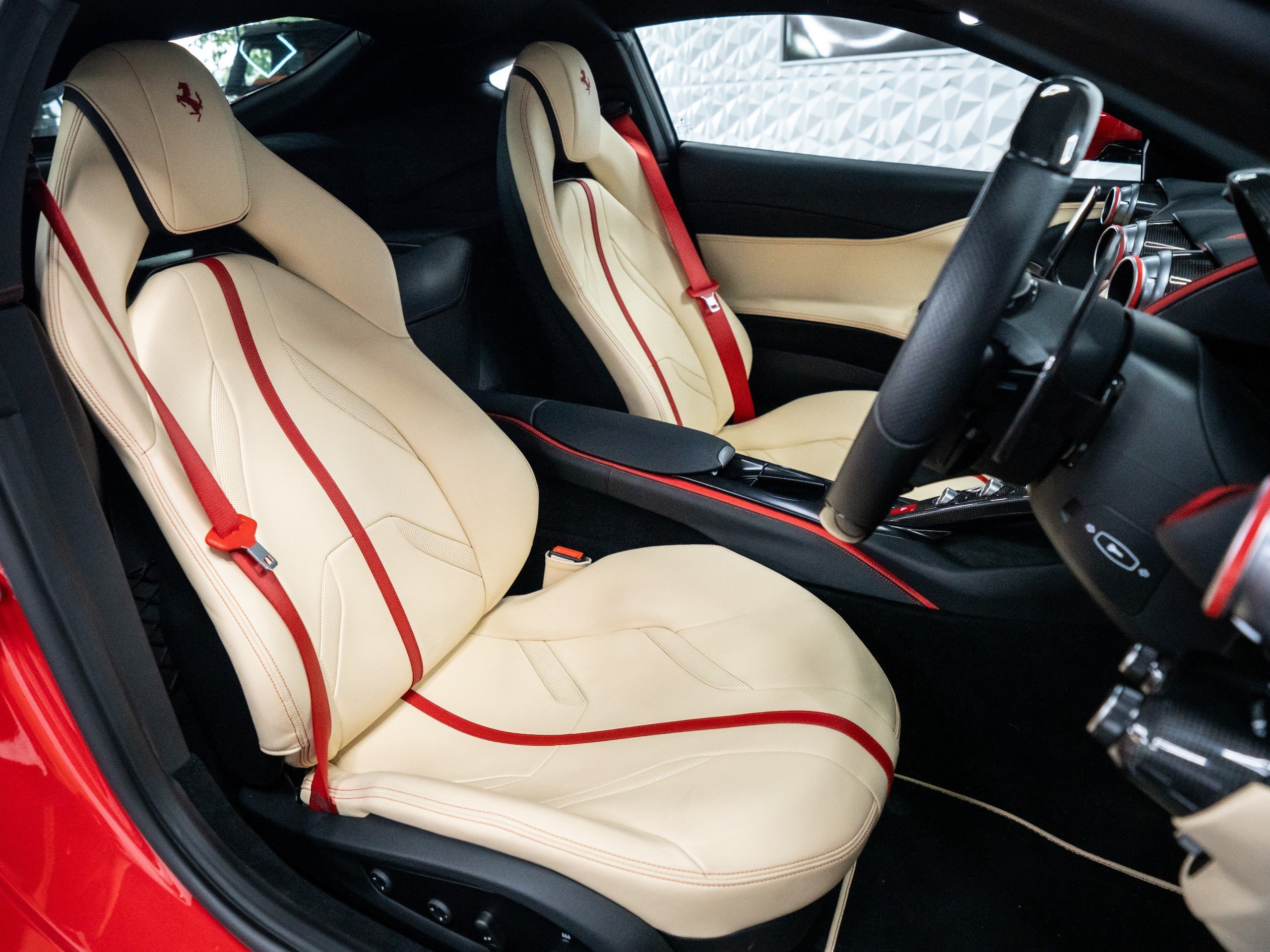 Internally, The Vehcile Is Complimented By Full Electric And Heated Crema Seats, Rosso Inner Details, Red Seat Belts, Cavallino Red Stitched Headrest, Crema Floor Mats With Red Logo, Carbon Fibre Driver Zone With LEDs, Yellow Rev Counter, Carbon Fibre Central Bridge, Dash Inserts In Carbon Fibre, Passenger Display, Rosso Special Stitching, Premium System System, Satellite Navigation And Navtrak Tracker System.